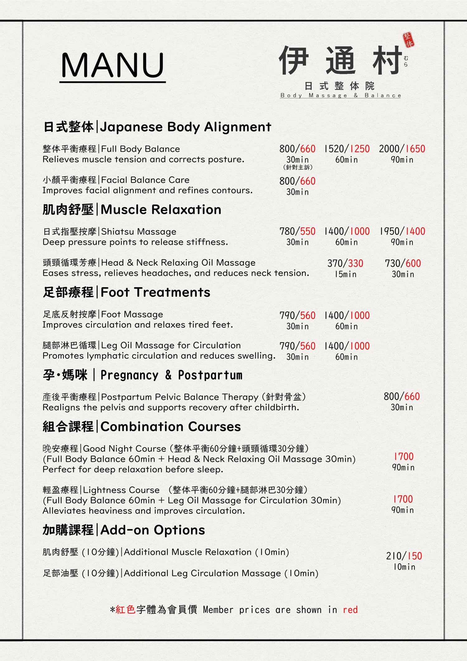 整体平衡療程 根據客人填寫的身體資料卡與簡單的檢查,藉由肌肉與骨骼的調整,從根本改善身體的不適。